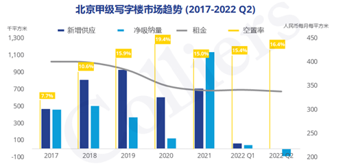 從北京市場(chǎng)來(lái)看,受到疫情和頭部互聯(lián)網(wǎng)公司面積整合影響,市場(chǎng)整體活躍度降低。高力國(guó)際數(shù)據(jù)顯示,二季度北京甲級(jí)寫字樓市場(chǎng)的凈吸納量為-8.3萬(wàn)平方米,這是繼2020年一季度后第一次出現(xiàn)負(fù)值。季度內(nèi)市場(chǎng)無(wú)新增供應(yīng),受到市場(chǎng)租賃活動(dòng)放緩、談判周期延長(zhǎng)等因素影響,整體空置率小幅回升到16.4%,市場(chǎng)租金也小幅回調(diào)至338.6元每月每平米。