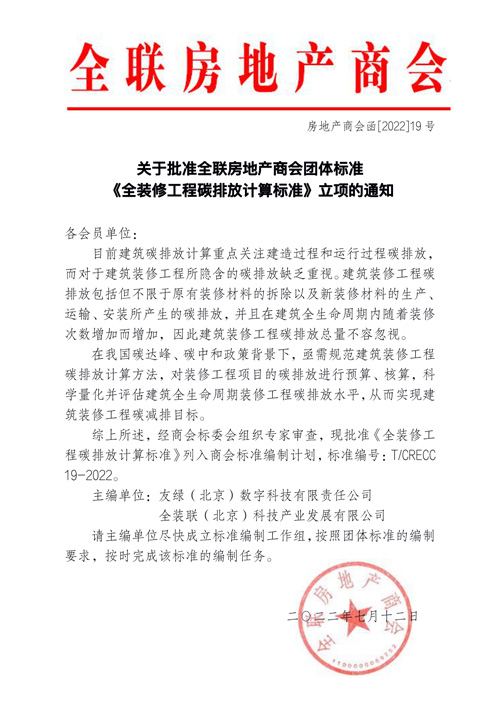 在綠色、節(jié)能、低碳、健康的產(chǎn)業(yè)發(fā)展大背景下,在全聯(lián)房地產(chǎn)商會(huì)的指導(dǎo)下,全裝聯(lián)(北京)科技產(chǎn)業(yè)發(fā)展有限公司、友綠(北京)數(shù)字科技有限責(zé)任公司聯(lián)合推動(dòng)的《全裝修工程碳排放計(jì)算標(biāo)準(zhǔn)》于2022年7月12日成功立項(xiàng),標(biāo)準(zhǔn)編號(hào)為:T/CRECC19-2022。本標(biāo)準(zhǔn)旨在規(guī)范建筑裝飾裝修工程碳排放計(jì)算方法,幫助項(xiàng)目裝飾裝修工程的碳排放預(yù)算、核算。