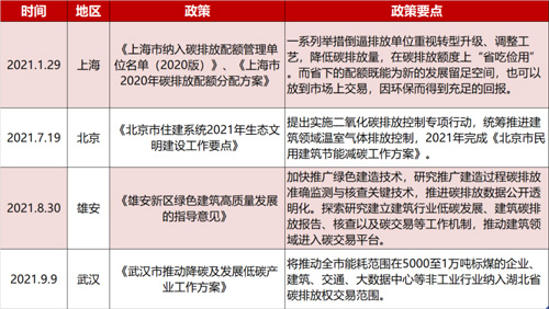 目前北京、上海、武漢、深圳已經(jīng)開(kāi)始出臺(tái)相關(guān)政策,推動(dòng)建筑領(lǐng)域進(jìn)入碳交易平臺(tái)。