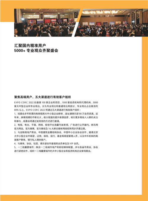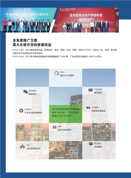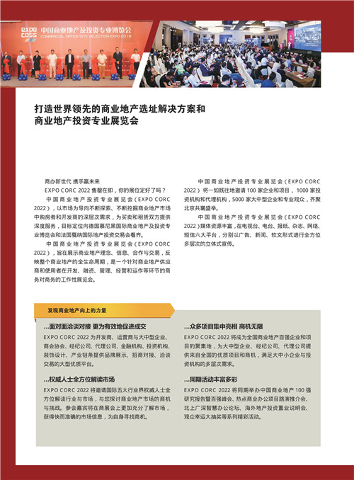 中國(guó)商業(yè)地產(chǎn)投資專業(yè)展覽會(huì)已連續(xù)成功舉辦十七屆,每一屆都得到了行業(yè)的矚目,成為全國(guó)優(yōu)秀商業(yè)辦公項(xiàng)目、產(chǎn)業(yè)園區(qū)及上下游企業(yè)的聚集地。2022中國(guó)商業(yè)地產(chǎn)投資專業(yè)展覽會(huì)(EXPO COSS 2021)將邀請(qǐng)100家企業(yè)和項(xiàng)目,1000家投資機(jī)構(gòu)和代理機(jī)構(gòu),1000家大中型企業(yè)和專業(yè)觀眾,為開發(fā)商、運(yùn)營(yíng)商與大中型企業(yè)、代理公司、金融機(jī)構(gòu)、裝飾設(shè)計(jì)、產(chǎn)業(yè)鏈條提供品牌展示、招商對(duì)接、洽談交易的大型優(yōu)質(zhì)平臺(tái)。
