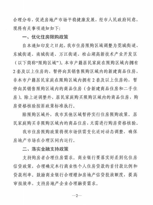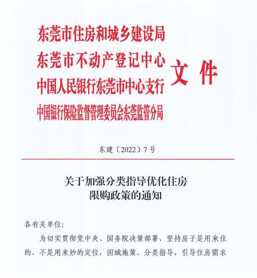 房訊網(wǎng)訊 7月4日,東莞市住房和城鄉(xiāng)建設(shè)局等四部門聯(lián)合發(fā)出《關(guān)于加強分類指導(dǎo)優(yōu)化住房限購政策的通知》(以下簡稱“通知”),將東莞市住房限購區(qū)域調(diào)整為莞城街道、東城街道、南城街道、萬江街道、松山湖高新技術(shù)產(chǎn)業(yè)開發(fā)區(qū),標志著我市房地產(chǎn)市場調(diào)控進入?yún)^(qū)域限購的新階段。