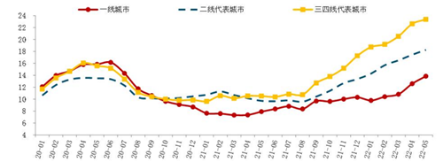 其中,截至2022年5月底,按近6個月月均銷售面積計算,一線城市短期庫存出清周期13.9個月;二線代表城市出清周期18.3個月,較2021年末延長4.9個月,短期庫存面臨一定壓力;三四線代表城市出清周期23.4個月,較2021年末延長6.1個月,市場庫存去化壓力較大。