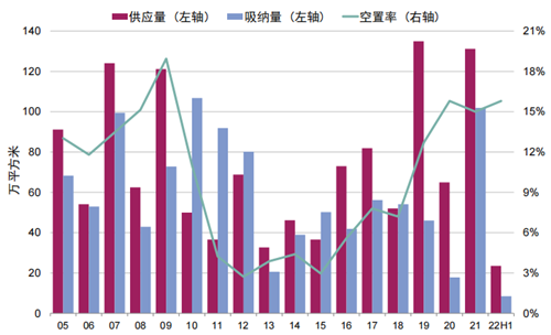 二季度,疫情的復發(fā)抑制了寫字樓租賃需求,同時疊加部分租戶退租的影響,使得單季度全市凈吸納量為-10,750平方米。上半年整體來看,全市累計凈吸納量為8.47萬平方米,較去年同期下降78.3%。