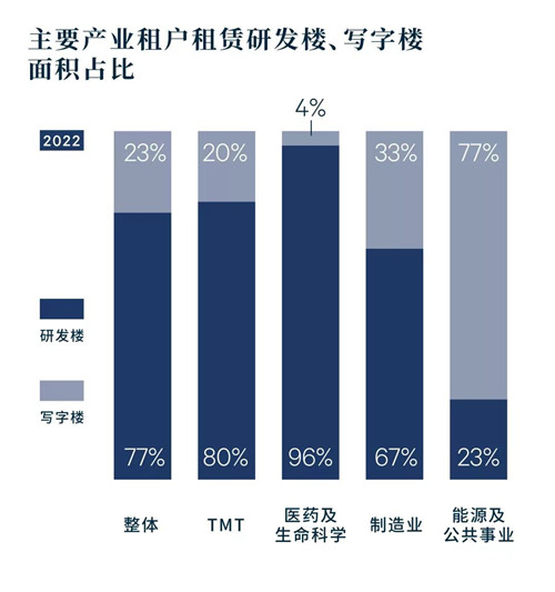 近年北京商務(wù)園區(qū)的產(chǎn)業(yè)研發(fā)創(chuàng)新屬性更趨明顯,TMT、醫(yī)藥及生命科學(xué)、先進(jìn)制造業(yè)等研發(fā)活動密集的產(chǎn)業(yè)對層高、承重、供電、環(huán)評等樓宇指標(biāo)有特殊要求,以安置其研發(fā)設(shè)備,因而更偏好專業(yè)的研發(fā)樓宇。而一般制造業(yè)、能源及公用事業(yè)等租戶則更多租賃一般標(biāo)準(zhǔn)的寫字樓,以落位其總部辦公、市場銷售等商務(wù)職能。