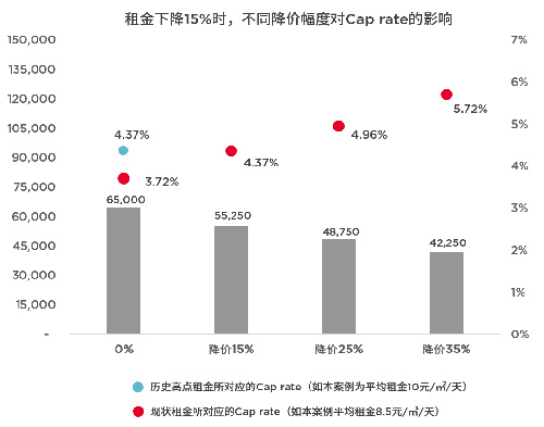 假定以一棟前幾年市場(chǎng)高點(diǎn)年購入的市中心寫字樓為例,購入后平均租金10元,之前售價(jià)6.5萬元/㎡,Cap rate約4.37%。該項(xiàng)目到了現(xiàn)在,平均租金跌幅為15%,當(dāng)單價(jià)下降15%時(shí)則對(duì)Cap rate沒有實(shí)質(zhì)影響;當(dāng)單價(jià)下降25%時(shí),Cap rate提升至4.96%(只略低于目前市場(chǎng)投資者回報(bào)要求);當(dāng)單價(jià)下降35%時(shí),Cap rate由4.37%提升至5.72%,該收益率已經(jīng)超過投資者回報(bào)要求,具備極大投資潛力吸引投資者。