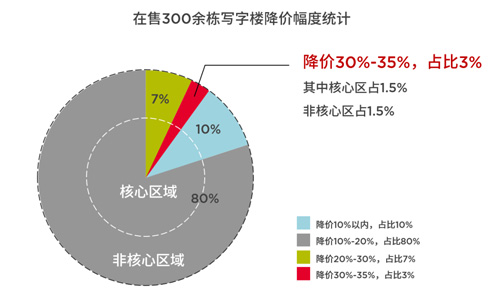 根據(jù)戴德梁行資本市場(chǎng)部統(tǒng)計(jì),目前市場(chǎng)在售的上海約300棟寫字樓中,調(diào)整幅度分布如下圖: