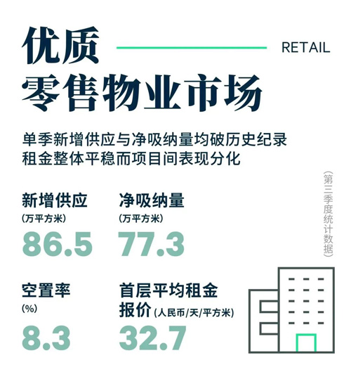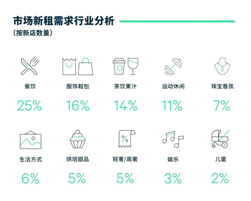 新開業(yè)項目多聚焦娛樂文化與精致家庭生活,以親子娛樂、地域美食、圈層社交、寵物友好等為主要招商理念吸引眾多餐飲、零售及生活方式品牌,如五棵松萬達的主題樂園MELAND CLUB亞洲旗艦店、龍湖北苑的本幫菜頭部選手桂滿隴、朝外THE BOX的MARSMART火星寵物超市等。既有項目方面,全國及北京首店在優(yōu)質購物中心多點開花,餐飲類首店以融合菜、茶飲、烘焙等業(yè)態(tài)為主,如山居滿隴、茉莉奶白、RAPL現(xiàn)烤卡仕達蘋果派等,而零售類首店則包括運動品牌Icebreaker、潮流服飾MOF Girls'mall、集合店Shel'tter等。整體來看總新增需求中餐飲業(yè)態(tài)以25%的新店占比持續(xù)領跑,其次是茶飲果汁、運動休閑以及輕奢/高奢品類等。疫情后各大商業(yè)體持續(xù)進行業(yè)態(tài)結構與品牌組合調整,季內錄得多個高端品牌換位至首層優(yōu)質鋪位。兒童體驗類業(yè)態(tài)遭遇復蘇疲軟,多家連鎖品牌縮減整合或閉店。全市凈吸納量在新增項目高開業(yè)率帶動下一洗上半年疲軟態(tài)勢,破歷史紀錄達77.3萬平方米,空置率環(huán)比小幅上漲0.2個百分點至8.3%。
