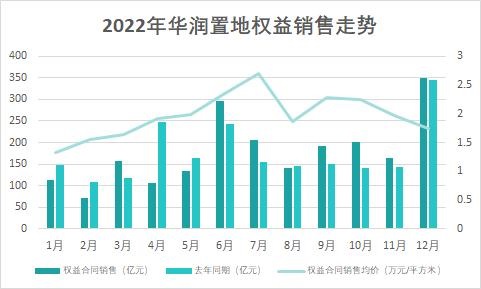 2022年12月,得益于年底銷售結算及下半年采取的積極清貨策略,華潤置地權益銷售環(huán)比增加111.65%。