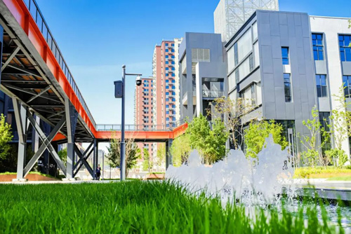 園區(qū)在設(shè)計時將“金隅紅”植入灰色鋪裝中,打造獨具金隅特色的“芯道”,同時靈活運用建筑元素營造特色空間,鋪設(shè)高架步行連廊,采用“高線公園”設(shè)計理念,也串聯(lián)起了散落在場地中的不同功能建筑,增強了建筑群落的立體感和錯落感。