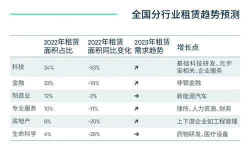 整體寫字樓租賃需求將自2023年開始逐步回暖,可重點關注證券資管、硬科技、高端制造、專業(yè)服務等增長確定性較高的行業(yè)。