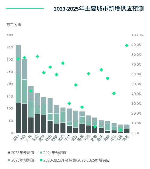 寫字樓租賃需求企穩(wěn)回升,以金融、科技和制造業(yè)為主力的需求引擎將推升全年凈吸納量至500萬平方米,新增供應將達800萬平方米,接近疫情爆發(fā)前5年的均值。2023年租金下跌趨緩,但仍有利于租戶擴張。