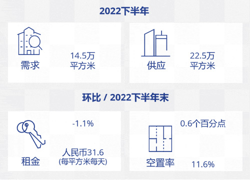 2022年下半年,受益于防疫政策優(yōu)化及疫情后消費提振的各項舉措,零售市場活力正在逐步恢復(fù)!靶率畻l”實施后出現(xiàn)的疫情高峰,對客流量階段性影響較大,導(dǎo)致年底錄得全市空置率相較上半年小幅上升,租金半年環(huán)比及同比均有一定下降。