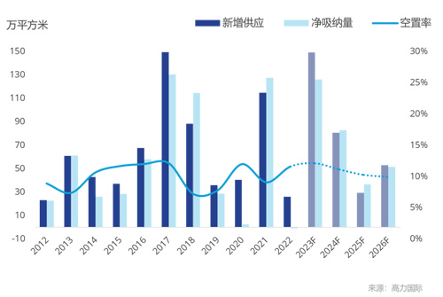 上海商業(yè)市場供應(yīng)、凈吸納量及空置率趨勢
