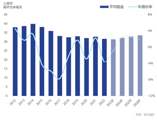 2022年受疫情影響,部分品牌因成本壓力被迫縮減運營規(guī)模,下半年空置率環(huán)比上升0.6個百分點至11.6%;平均租金半年環(huán)比下降1.1%,同比下降3.6%至31.6元每平方米每天。