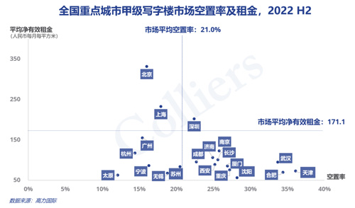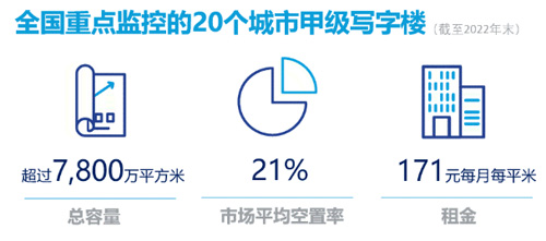 截至到2022年末,全國重點監(jiān)控的20個城市甲級寫字樓總存量超過7,800萬平方米,市場平均空置率上升至21%,租金下降至171元每月每平米。