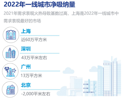 1、2021年需求表現(xiàn)火熱導(dǎo)致基數(shù)過高。上海是一線城市中需求表現(xiàn)最好的市場,2022年凈吸納量達(dá)到近60萬平方米,但也只有2021年的一半左右;其次是深圳市場,相較于2021年115萬平米的凈吸納量,2022年大幅回落到43萬平米左右,降幅超過60%。廣州市場的凈吸納量從2021年的48萬平米收縮到2022年的13萬平米。降幅最大的則是北京市場,從2021年113萬平方米降到2022年的-2,000平米左右。