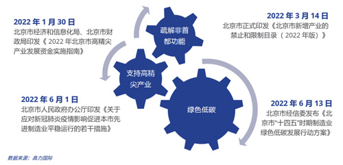 產(chǎn)業(yè)政策層面,2022年北京市年度產(chǎn)業(yè)政策集中體現(xiàn)在三個關鍵詞上:疏解,支持,綠色低碳。