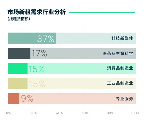 季度成交活動呈樂觀活躍態(tài)勢,行業(yè)需求穩(wěn)步釋放,除自用及續(xù)租外,約七成成交來自于新設(shè),另三成來自擴張。TMT行業(yè)以37%的占比保持租賃需求首位,其中華為繼續(xù)擴租推動電信通訊子行業(yè)持續(xù)火熱;電商類企業(yè)在漕河涇積極新設(shè);另錄得多領(lǐng)域軟件開發(fā)和科技互聯(lián)網(wǎng)類新興企業(yè)成交。搶占數(shù)字經(jīng)濟發(fā)展新機遇,擁有成熟盈利模式并依賴人才資源的TMT企業(yè)仍是市場主力租賃需求。生物醫(yī)藥以17%的占比位列第二,并集中在以張江為核心,聯(lián)動外高橋、金橋及浦江特色園區(qū)的區(qū)域;就細(xì)分賽道而言,創(chuàng)新藥及研發(fā)外包持續(xù)火熱。后疫情時代,醫(yī)藥行業(yè)投資信心修復(fù),創(chuàng)新能力成為主要發(fā)展引擎,發(fā)掘更多藍海市場。得益于蔚來汽車持續(xù)擴租及聯(lián)合汽車電子擴產(chǎn)新租活動,消費品制造業(yè)季度需求達15%。以新能源汽車為代表的汽車市場有望在2023年繼續(xù)呈現(xiàn)穩(wěn)中向好態(tài)勢,拉動產(chǎn)業(yè)鏈相關(guān)企業(yè)煥發(fā)租賃需求新動能。