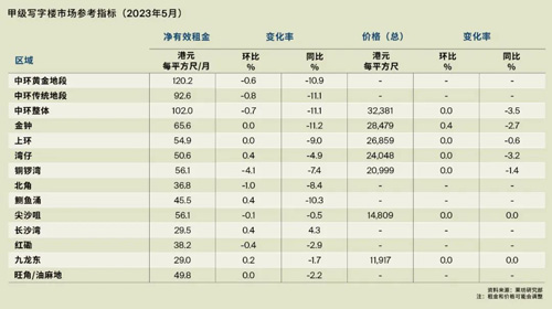 受壓于空置率飆升,港島區(qū)整體甲級寫字樓租金于5月份進(jìn)一步下跌。2023年的前五個(gè)月,港島區(qū)整體甲級寫字樓租金下跌2.5%。其中,中環(huán)寫字樓租金的跌幅最高,達(dá)到4.1%。