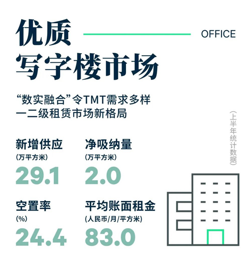 相應(yīng)地,優(yōu)質(zhì)寫字樓市場整體空置率較去年底上升3.6個百分點至24.4%;以價換量為市場去化的主旋律,導(dǎo)致平均租金仍處下行通道,跌幅為0.6%。