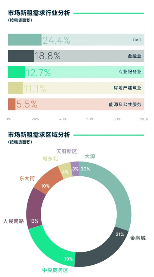 具體而言,“數(shù)實融合”發(fā)展背景之下,成都數(shù)字化與工業(yè)化加速融合發(fā)展,不僅為TMT需求增長續(xù)以動能,也令細(xì)分行業(yè)需求日趨多樣。統(tǒng)計顯示,上半年工業(yè)互聯(lián)網(wǎng)需求占比攀升至82.1%,且其中不乏農(nóng)業(yè)科技、房地產(chǎn)科技、數(shù)字工業(yè)設(shè)計等“數(shù)實融合”典型案例的需求落地;51.2%的TMT需求為內(nèi)資企業(yè)貢獻(xiàn);34.9%的TMT需求落于大源。