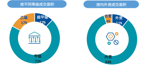 按行業(yè)劃分的租賃活動(dòng)中,以TMT行業(yè)為首,占49%;金融業(yè)占據(jù)了12%的第二大份額,但連續(xù)兩季度活躍度降低;專業(yè)服務(wù)以8%的占比排列第三。相較于上季度,CBD商圈成交降低幅度最大,成交面積錄得10%。本季度超甲級(jí)寫(xiě)字樓的成交交易達(dá)到12%,說(shuō)明部分企業(yè)把握機(jī)遇提升樓宇品質(zhì)。內(nèi)資企業(yè)的成交面積依然遠(yuǎn)遠(yuǎn)大于外資企業(yè)的成交面積。