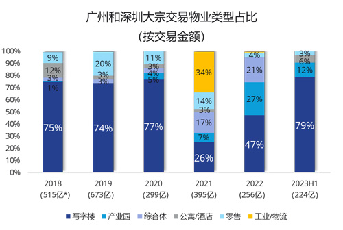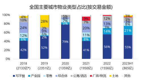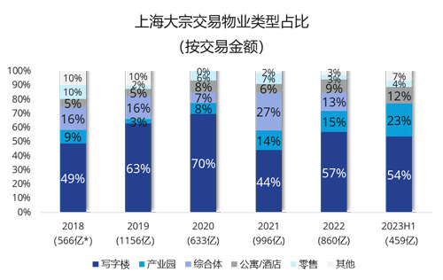 據(jù)統(tǒng)計(jì),2018年至2022年的主導(dǎo)交易物業(yè)類型為寫字樓,但2023年上半年,寫字樓交易金額占比有下降的跡象。