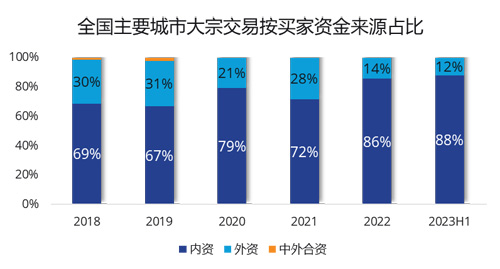 從大宗交易資金來源分析,中國主要城市的大宗成交仍以內(nèi)資為主。至2022年上半年中國主要城市內(nèi)資交易金額占比近88%,延續(xù)了其主導(dǎo)地位。