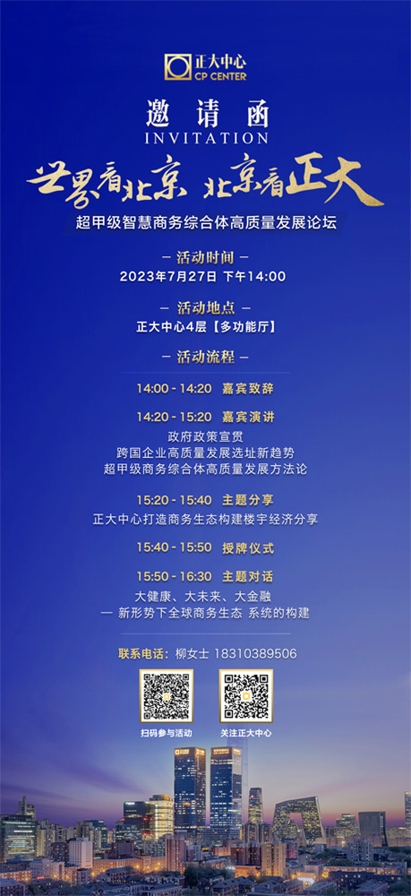 7月27日,世界看北京,北京看正大!誠邀業(yè)界嘉賓,共同譜寫超甲級智慧商務(wù)綜合體高質(zhì)量發(fā)展的未來華章。