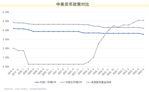 國(guó)內(nèi)貨幣政策維持穩(wěn)健,央行6月已經(jīng)調(diào)降MLF、OMO和LPR利率10BP,為國(guó)內(nèi)房地產(chǎn)市場(chǎng)、信貸市場(chǎng)、經(jīng)濟(jì)修復(fù)等帶來(lái)多重利好。但美聯(lián)儲(chǔ)加息通道未接近終點(diǎn),中美利率差異持續(xù)走闊,仍然是影響國(guó)際資本流動(dòng)和資產(chǎn)價(jià)格表現(xiàn)的桎梏。