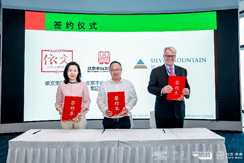 北京豐臺文化旅游集團有限公司總經(jīng)理殷明,銀山集團聯(lián)合創(chuàng)始人董事長莫林澤 (Stefan Matzinger),依文集團副總裁、依文中國手工坊總裁溫巍上臺簽約。