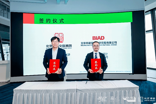 北京市建筑設(shè)計研究院副總建筑師、第七建筑設(shè)計院院長及黨總支書記、未來院執(zhí)行院長高博,北京豐臺文化旅游集團有限公司副總經(jīng)理申瑾上臺簽約