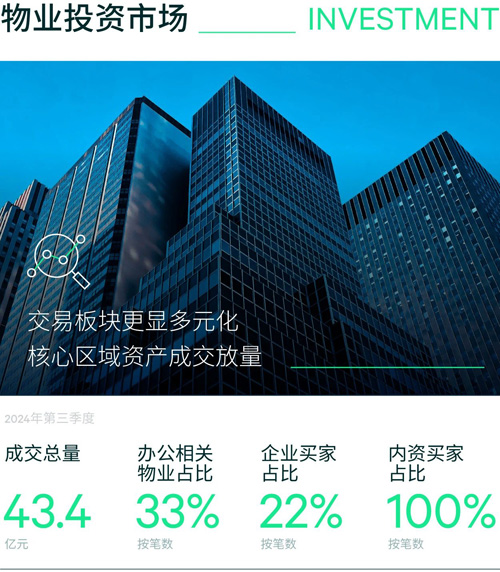 2024年第三季度,北京物業(yè)投資市場交易一共錄得九筆交易,共計交易總額43.4億元,環(huán)比和同比分別下滑64%和73%。