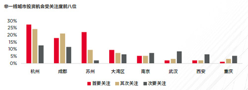 北京、上海各類資產(chǎn)受投資人關(guān)注的比例最高,體現(xiàn)了市場對北、上兩座城市的投資偏好;非一線城市因其經(jīng)濟的快速發(fā)展和相對較高的投資收益率,正逐漸成為投資者的新焦點。關(guān)注度最高的前5名城市或區(qū)域分別為杭州、成都、蘇州、大灣區(qū)(廣、深除外)及南京。