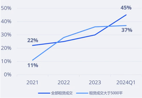 ▎新質(zhì)生產(chǎn)力企業(yè)租賃成交數(shù)量占比,2021-2024Q1 數(shù)據(jù)來源:高力國際