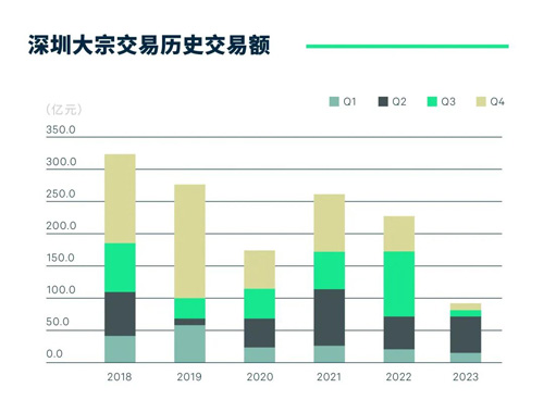 2023年第四季度,深圳大宗交易市場僅錄得2宗交易,一宗為寫字樓,一宗為工業(yè)物業(yè)?傮w成交金額共人民幣7.6億元,環(huán)比錄得49.2%的漲幅,但是同比仍有較大差距。季內(nèi)的兩宗交易均采取資產(chǎn)交易的方式進行,且買家均來自企業(yè)。2023全年深圳大宗交易市場表現(xiàn)平淡,共錄得26宗交易,總體成交金額為人民幣77.6億元,僅相當于去年交易額的36.0%,主要原因在于一方面,受企業(yè)謹慎擴張情緒影響寫字樓物業(yè)租金走弱,另一方面是因為超大額度的交易依然還在進行中,尚未完結(jié)。