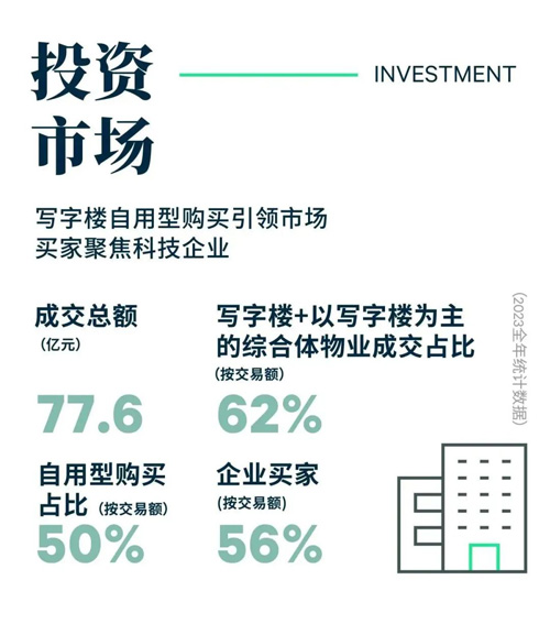 成交物業(yè)類型方面,寫字樓和以寫字樓為主的綜合體物業(yè)為2023年市場的成交主力,分別貢獻了33.0%和29%的交易額,成交物業(yè)主要來自核心拓展區(qū),新興區(qū)域也有少量交易錄得。自用型購買引領(lǐng)寫字樓交易市場,除少量未知目的外,年內(nèi)所有寫字樓物業(yè)交易均為自用型。深圳本地科技公司為購買主角,按照宗數(shù)統(tǒng)計,約4成買家為深圳科技企業(yè),細分領(lǐng)域涵蓋電子、半導體、地理信息技術(shù)和環(huán)衛(wèi)技術(shù),此外還錄得一宗來自深圳鋰電池企業(yè)的購買。而深圳以外的自用買家分別為來自香港的金融企業(yè)以及來自蘇州的電器科技企業(yè)。從相應交易公告得知,所購買寫字樓多出于戰(zhàn)略考量,擬用作企業(yè)總部或研發(fā)總部以招攬人才和樹立更好的企業(yè)形象。另外,年內(nèi)也錄得了來自工業(yè)和商業(yè)物業(yè)的交易,二者的交易額占比均為14%。