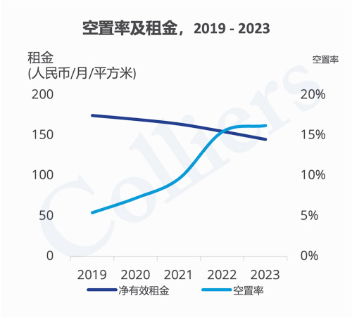 截至2023年第四季度,廣州甲級寫字樓空置率為16.2%。得益于今年新入市項目的自用面積去化以及個別項目延期入市,今年全市空置率上升低于1.0個百分點,空置率增長速度低于預(yù)期。在子市場中,越秀市場“以價換量”成效相對顯著,空置率在今年下降約5.0個百分點,錄得子市場中最大降幅。