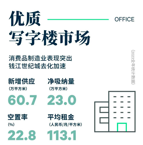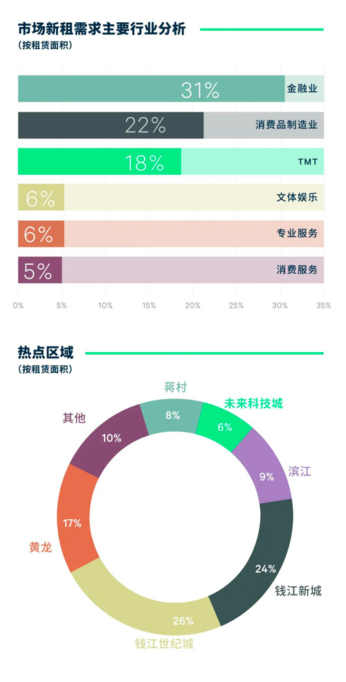 行業(yè)需求方面,2023年全年,以銀行、保險(xiǎn)和證券為代表的金融類租戶持續(xù)整合升級搬遷,布點(diǎn)以錢江新城為代表的主要板塊,占比31%,年內(nèi)需求以升級整合為主導(dǎo)。此外,消費(fèi)品制造業(yè)受某新能源汽車企業(yè)大面積落地影響,需求占比躍升,以22%的占比位居需求次席,除新能源汽車類租戶外,年內(nèi)亦有包括服飾珠寶、食品以及快消品等消費(fèi)品品類租戶落址。TMT類租戶需求穩(wěn)健,占比18%,主要以直播電商需求活躍于直播相關(guān)熱點(diǎn)板塊。值得一提的是,消費(fèi)服務(wù)類年內(nèi)需求活躍,醫(yī)美和教育留學(xué)相關(guān)品類租戶需求顯著。