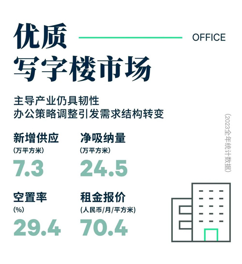 2023年西安優(yōu)質(zhì)寫字樓市場供應小幅下滑,整體市場共錄得2個寫字樓交付,合計約7.3萬平方米;其中甲級寫字樓占比68.5%。受部分本地業(yè)主租賃策略及對市場的謹慎態(tài)度影響,導致年內(nèi)出現(xiàn)數(shù)宗延遲交付,新增供應同比下降28.8%。著眼需求端,整體市場需求相對活躍,雖年內(nèi)宏觀環(huán)境不明確性增強及行業(yè)調(diào)整致使需求出現(xiàn)小幅波動,但全年來看,西安寫字樓市場需求仍具韌性,年內(nèi)實現(xiàn)24.5萬平方米的凈吸納量,同比增加86.0%。市場需求的活躍,推動市場整體空置率同比下降2.8個百分點至29.4%。全年租金仍呈下行趨勢,可比項目租金同比下降4.0%至每月每平方米70.4元。