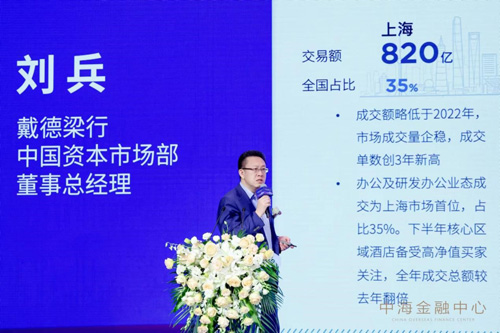 優(yōu)質(zhì)商辦資產(chǎn)的發(fā)展離不開主力相關(guān)產(chǎn)業(yè),以及大宗交易市場的持續(xù)影響;顒又,戴德梁行中國資本市場部董事總經(jīng)理 劉兵先生,用詳盡的數(shù)據(jù)為參會嘉賓帶來了《北京市商業(yè)地產(chǎn)大宗交易市場走勢暨金融業(yè)優(yōu)質(zhì)辦公資產(chǎn)解析》。