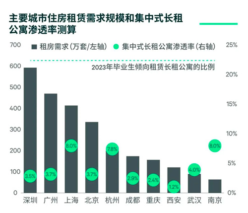 CBRE的測(cè)算顯示,國內(nèi)主要城市的機(jī)構(gòu)化長(zhǎng)租公寓滲透率均低于10%。與此形成對(duì)比的是,58同城和安居客發(fā)布的《2023年畢業(yè)生租住報(bào)告》顯示,傾向于租賃長(zhǎng)租公寓的畢業(yè)生占比達(dá)到22%,這一年輕群體無疑更能體現(xiàn)住房租賃消費(fèi)的未來演變方向。