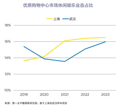 在商場數(shù)據(jù)中我們也能窺見一斑,購物中心內(nèi)休閑娛樂業(yè)態(tài)整體占比在2023年持續(xù)提升。在上海,休閑娛樂類業(yè)態(tài)占比由2019年的13.6%增長至16.5%。運動健身、親子活動、影院劇場、酒吧演出等多個細分業(yè)態(tài)涌現(xiàn)新品牌或新內(nèi)容。此外,消費者對向內(nèi)精神需求的追求和對文藝展覽類空間的品質(zhì)要求更高,文旅融合有望成為新興亮點。