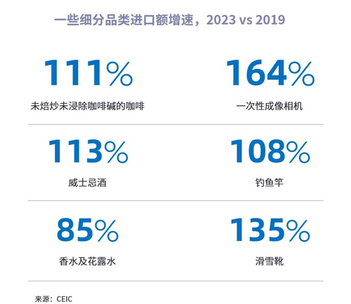 零售市場的大類及品牌豐富程度已今非昔比,一些新品類正成為增長亮點。從中國進口產(chǎn)品增速來看,體育用品中的釣魚、滑雪;護膚美妝類中的香水;電子消費品中的一次性成像相機不僅保持高速增長,相較疫情前更近乎或超過翻倍增長,是值得關注的潛力。而在食品類,咖啡及威士忌酒進口額較疫情前2019年均增長超過100%。在餐飲類門店中,各類創(chuàng)意咖啡層出不窮,以年輕消費者為主的小酒館已由街角走入購物中心。