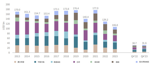 亞太區(qū)各主要市場(chǎng)2013-2023年商業(yè)地產(chǎn)投資額(單位:十億美元)