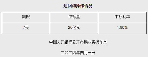 4月1日電 據(jù)中國(guó)人民銀行網(wǎng)站消息,為維護(hù)銀行體系流動(dòng)性合理充裕,2024年4月1日人民銀行以利率招標(biāo)方式開(kāi)展了20億元逆回購(gòu)操作。