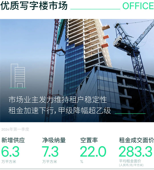 本季度大面積退租情況逐漸減少,全市凈吸納量環(huán)比增加兩倍達(dá)7.3萬平方米。中關(guān)村、奧體等科技中心,以及麗澤、通州和石景山等新興商務(wù)區(qū),受益于租戶換遷意愿的增強(qiáng),季內(nèi)凈吸納量均超過一萬平方米。整體空置率受新增供應(yīng)影響,環(huán)比小幅抬升0.3個(gè)百分點(diǎn)至22.0%。全市平均租金面價(jià)加速下行,同樣本比環(huán)比下降2.0%至每月每平方米283.3元,其中王府井、CBD、金融街、望京、燕莎等區(qū)域跌幅靠前。與此同時(shí),面對(duì)市場(chǎng)對(duì)優(yōu)質(zhì)租戶的激烈競(jìng)爭(zhēng),部分標(biāo)桿樓宇希望通過降租獲得更大的主動(dòng)權(quán),使得甲級(jí)租金跌幅在近七個(gè)季度內(nèi)首次超過乙級(jí)。