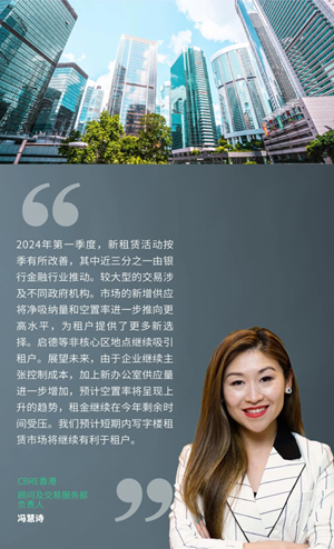 在2024年第一季度,受近期竣工項(xiàng)目的搬遷和整合需求帶動(dòng),寫字樓租賃成交量較上季增加35%,達(dá)130萬平方尺。