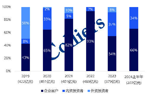 近三年外資投資活動不斷減少,2024年上半年,93%的資金來源是內(nèi)資機構(gòu)。