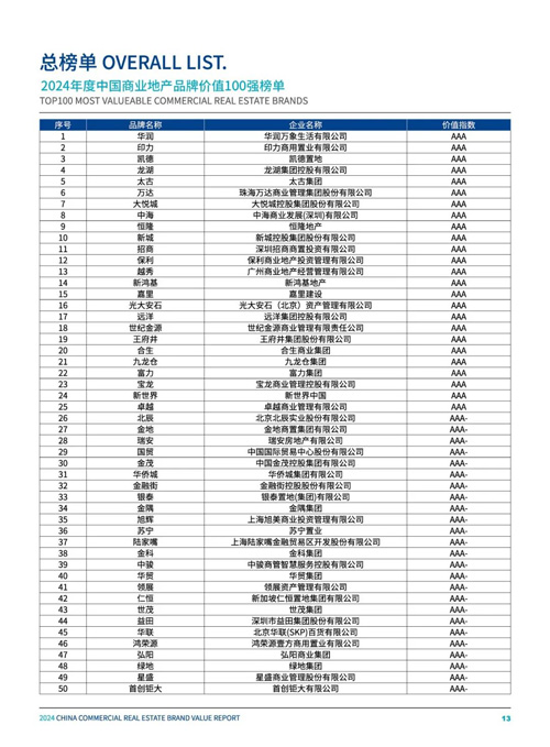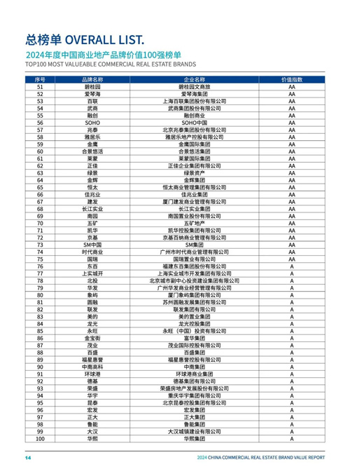 2024年度中國(guó)商業(yè)地產(chǎn)品牌價(jià)值100強(qiáng)榜單